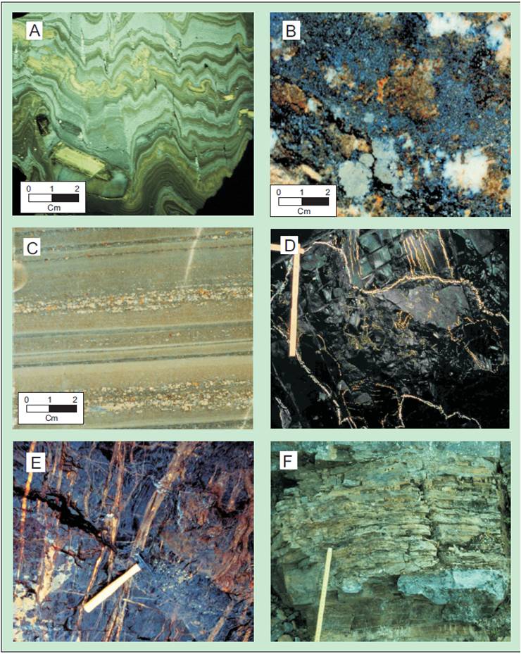 Gambar (A) : Bedded facies : sphalerit dan galena interlaminasi dengan pirit, hidrotermal karbonat, dan carbonaceus chert. (B) : Urat Kompleks : Pyrite, Sphalerite, Galena, dan Ferroan Carbonaceous. (C) : Dystal hidrotermal sediments. (D) : breksi yang terisikan oleh Sphalerite, dan calcopyrite. (E) : Urat Sphalerite pada Silicified Shale (F)
